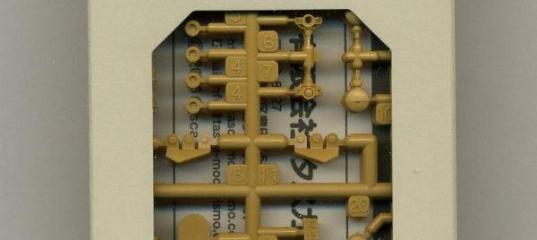 Картонная коробка, размером чуть больше сигаретной пачки содержит две одинаковые литниковые рамки с деталями светло-коричневого цвета и один лист инструкции на японском языке. Впрочем, незнание иероглифов Страны восходящего солнца сильно не помешает – этапы сборки показаны рисунками-схемами, а обозначения цветов из палитры Tamiya даны на английском.