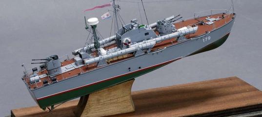 1/100 Проект 183УЧтобы завершить мою серию 183-х размещу еще один. Модель,которая больше всего нравится мне самому.Конечнона этом корпусе было построено еще много различных вариантов. От разъездных для высокого начальства,до радиосвязи и даже радиоуправляемых мишеней.Пограничники тоже охотно пользовались. Скорость была очень подходящая. Зачастую просто снимали торпедные трубы и так использовали. Артустановка 2М3-м у супостатов-нарушителей вызывала уважение. К этому времени разработали звездообразные дизеля аж о 72 цилиндрах. Высокооборотистые. Вот только длинноваты они были для стандартного корпуса 183. Поэтому его не мудрствуя удлиннили на метр в сторону кормы продолжая обводы. А чтобы по палубе догонялки не вздумали устраивать поставили 4 торпедные трубы калибра 533мм. Серьезный красавец получился. |