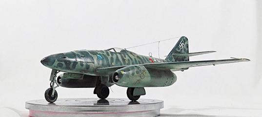 Êîíâåðñèÿ 1/48 Messershmitt Me-262 HGII ÿíâàðå 1944 ã. æåëàíèå óëó÷øèòü õàðàêòåðèñòèêè Me 262, â òî âðåìÿ íàõîäèâøåãîñÿ â ñòàäèè ïðîòîòèïîâ, ïîëó÷èëî íîâûé èìïóëüñ íà âñòðå÷å ñ ïðîôåññîðîì Ìåññåðøìèòòîì , âî âðåìÿ êîòîðîé îí ïðåäëîæèë ïîñòðîèòü «âûñîêîñêîðîñòíîé ýêñïåðèìåíòàëüíûé ñàìîëåò äëÿ îöåíêè ñîâðåìåííûõ çíàíèé î ïîëåòå íà âûñîêèõ ÷èñëàõ Ìàõà». Ñàìîëåò äîëæåí áûë èìåòü êðûëî ñòðåëîâèäíîñòüþ 35 ãðàäóñîâ è ïðèâîäèòüñÿ â äâèæåíèå äâóìÿ ðåàêòèâíûìè äâèãàòåëÿìè.  ìàðòå 1944 ãîäà Âèëëè Ìåññåðøìèòò îôèöèàëüíî âûäâèíóë ïðåäëîæåíèå î ìîäèôèöèðîâàííîé âåðñèè Me 262, êîòîðàÿ áóäåò èçâåñòíà êàê Me 262 HG (Hochgeschwindigkeit - âûñîêîñêîðîñòíîé), èç êîòîðûõ áûëî òðè âîçìîæíûõ âàðèàíòà, âñå ñî ñòðåëîâèäíûìè êðûëüÿìè è õâîñòû äëÿ âûñîêèõ ñêîðîñòåé.  ñëó÷àå HG III, íàèáîëåå ñîâåðøåííîãî èç òðåõ âàðèàíòîâ, â ïëàíå îò 24 äåêàáðÿ 1944 ãîäà ñàìîëåò äîëæåí áûë èìåòü êðûëî è õâîñòîâîå îïåðåíèå, ñòðåëîâèäíîå íàçàä íà 45 ãðàäóñîâ âìåñòå ñ îáòåêàåìûì ôîíàð¸ì, à âçëåòíàÿ òÿãà äîëæíà áûëà ïîñòóïàòü îò ñäâîåííûõ äâèãàòåëåé BMW 003C, Jumo 004D èëè HeS 011A, ñ ðàçìåùåíèåì â êîðíÿõ êðûëà. Íà ðóáåæå 1944-45 ãîäîâ â Ëåõôåëüäå áûëè ãîòîâû êîíâåðñèîííûå äåòàëè äëÿ âàðèàíòà HG II. Íî ïåðåä òåì, êàê ñîñòîÿëñÿ ïåðâûé ïîëåò çàâîäñêîé íîìåð ¹ 111538, âòîðîé ïðîòîòèï áûë ïîâðåæäåí â Ëåõôåëüäå. Ðåìîíò íå ìîã áûòü çàâåðøåí èç-çà îòñóòñòâèÿ äåòàëåé. Î ìîäåëèÄîëãîå âðåìÿ ó ìåíÿ ëåæàëè îñòàòêè îò ìîäåëè Ìèñòåëü 4 îò Dragon— ïî÷òè ïîëíûé íàáîð äëÿ 1 ìåññåðà, íå õâàòàëî êðûëüåâ, äâèæêîâ è ñòàáèëèçàòîðîâ. Äàâíî áûëî æåëàíèå ñäåëàòü Me-262 HGII. Îñíîâíàÿ çàäà÷à — êðûëüÿ, ñäåëàë âñòàâêè äëÿ èçìåíåíèÿ ñòðåëîâèäíîñòè (42ãðàäóñà) èç êðûëüåâ íåêîìïëåêòíîé ìîäåëè íîâî. Äàëåå ïîäãîíêà äâèãàòåëåé, çàêîíöîâêè êðûëüåâ, êîððåêòèðîâêà ðàñøèâêè ïàíåëåé êðûëüåâ, ñâÿçàííîé ñ èçìåíåíèåì ïîëîæåíèÿ äâèãàòåëåé. Èç-çà óìåíüøåíèÿ âûñîòû ôîíàðÿ, âàííó êàáèíû óñòàíîâèë íèæå ïðèìåðíî íà 3 ìì è ñîîòâåòñòâåííî íàðàñòèë ñòåíêè âàííû. Ïåðåäíÿÿ ÷àñòü ìîäåëè ñîñòîèò èç äåòàëåé 3 ôèðì — ôþçåëÿæ îò Äðàãîíà, ìåòàëëè÷åñêàÿ äåòàëü îñíîâàíèÿ ñ íèøåé ïåðåäíåé ñòîéêè îò Òàìèè, äåòàëü ñ ïóøå÷íûìè ïîðòàìè îò ÕÁ (äðàãîíîâñêàÿ äåòàëü áûëà óòåðÿíà). Òàê êàê êðûëüÿ «óøëè» âïåðåä, îáðàçîâàëèñü ñêâîçíûå ùåëè â ôþçåëÿæå â ðàéîíå çàêðûëêîâ.  õâîñòå ïðèêëåèë âûñòóï òèïà êîñòûëÿ. Ôîíàðü âûäàâèë èç ïðîçðà÷íîé óïàêîâêè îò òîðòà.  êàáèíå, íèøàõ äîáàâèë ïðîâîäêó è ò. ï., ïëþñ ÁÀÍÎ è îñòàëüíûå ìåëî÷è. Îêðàñêà — íèòðîêðàñêè ñî ñòðîèòåëüíîãî ìàãàçèíà ñàìîçàìåñîì. Äàëåå òîíèðîâêà, äåêàëè èç îñòàòêîâ îò ñòàðûõ ìîäåëåé. Êàìóôëÿæ ÐËÌ 74=> - âûäóìàííûé ïîä òèãðîâóþ àêóëó.