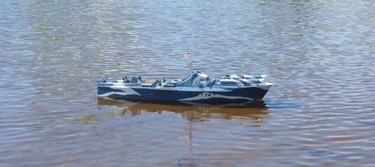 Îñíîâíàÿ ïðîáëåìà ïðè ñáîðêå – îïðåäåëèòüñÿ ñ ðåàëüíûìè äîðàáîòêàìè äèâåðñèîííîé âåðñèè, òàê êàê â îïèñàíèÿõ êàòåðà èìååì îäíî, à ðåàëüíûå ôîòî (èõ âñåãî òðè) ïîêàçûâàþò äðóãîå. Åñëè âåðèòü îïèñàíèþ, âçÿòîìó èç ðàçëè÷íûõ èñòî÷íèêîâ èíòåðíåòà, íà êàòåðå äëÿ åãî èñïîëüçîâàíèÿ â êà÷åñòâå äèâåðñèîííîãî, áûëè âûïîëíåíû ñëåäóþùèå èçìåíåíèÿ: Ñ ó÷¸òîì âûøåèçëîæåííûõ ìûñëåé ïðåäïîëîæèë, ÷òî íîâûå ãëóøèòåëè òðåáîâàëèñü äëÿ íîâûõ äâèãàòåëåé (ïî äâà ãëóøèòåëÿ íà îäèí äâèãàòåëü), à ñòàðûå âûõëîïà îñòàëèñü íà ìåñòå. Çàòåì çàíÿëñÿ êîðïóñîì ìîäåëè. Ïðèêëåèë êîðìó, âðåçàë äåéäâóäû, îòöåíòðîâàë è ïðèêëåèë èõ, çàòåì äëÿ ïðî÷íîñòè è ãåðìåòè÷íîñòè çàëèë ñòûêè äâóõêîìïîíåíòíîé øïàêë¸âêîé. Ïîñòàâèë äâèãàòåëè. Ñäåëàë ðóëè. Êîíñòðóêöèÿ ðóëåâîé ñèñòåìû â ìîäåëè àáñîëþòíî àíàëîãè÷íà ïî âíåøíåìó âèäó ðåàëüíî ñóùåñòâîâàâøåé, òîëüêî âìåñòî áîëòîâ ñ ãîëîâêîé 1-1,5 ìì ïðèøëîñü ïîñòàâèòü íåñêîëüêî áîëåå êðóïíûå èçäåëèÿ (íà ñëó÷àé âîçìîæíîãî ðåìîíòà). Èç óïàêîâî÷íîãî óïëîòíèòåëÿ ñîîðóäèë ïîñàäî÷íûå ìåñòà äëÿ àïïàðàòóðû, ñìîíòèðîâàë âñ¸ íà ðåçèíîâûé êëåé, ñïàÿë ïåðåõîäíèêè, ïîñòàâèë ìîùíûé âûêëþ÷àòåëü ÷òîáû íå ñíèìàòü êàæäûé ðàç äëÿ îïåðàöèé ïî îòêëþ÷åíèþ è çàðÿäêå àêêóìóëÿòîðà ïàëóáó. Òàê æå óäëèíèë øëåéô çàðÿäêè íà àêêóìóëÿòîð. Íà ïàëóáå âûáðàë ýëåìåíò äëÿ ë¸ãêîãî äîñòóïà ê âûêëþ÷àòåëþ è øëåéôó çàðÿäêè, ñäåëàë âëàãîçàùèù¸ííóþ êðûøêó. Íà íå¸ ïðèøëîñü ñìîíòèðîâàòü è ñïàñàòåëüíûé ïëîò, ÷òîáû íå ñíèìàòü åãî îòäåëüíîé äåòàëüþ. Äàëåå âûáðàëñÿ íà ïàëóáó. Äîñêè ïàëóáû íà ìîäåëè ñûìèòèðîâàíû íåâíÿòíûìè, ïî÷òè íåâèäèìûìè ïîëîñêàìè, ÷òî íå ñîîòâåòñòâóåò âèäó íà ôîòî. Ïðèøëîñü ïðîðåçàòü ñêðàéáåðîì âñþ ïàëóáó. Òàê æå îáðàòèë âíèìàíèå íà íåñòûêîâêó ïàëóáíûõ ýëåìåíòîâ íà ôîòî è òåìè äåòàëÿìè, êîòîðûå ïðåäëàãàåò ïðîèçâîäèòåëü ìîäåëè. Ïðèøëîñü ïåðåíåñòè íåêîòîðûå äåòàëè, äîáàâèòü îäèí êíåõò, èçìåíèòü âûñîòó âåíòèëÿöèîííûõ òðóá. Èëëþìèíàòîðû è îêíà ðóáêè êëåèë íà ñóïåðêëåé è çàëèâàë ñ îáåèõ ñòîðîí ôóòóðîé. Òðóá÷àòóþ êîíñòðóêöèþ íà íîñó óêðåïèë ïðè ïîìîùè ìåäèöèíñêèõ èãë è çàîäíî ñäåëàë ñú¸ìíîé. Îòãðóíòîâàë ìîäåëü àýðîçîëüíûì ãðóíòîì è îòøëèôîâàë ñ âîäè÷êîé. Ñ îêðàñêîé íèæå âàòåðëèíèè âñ¸ ïðîñòî – ÷¸ðíîé êðàñêîé àâòîìîáèëüíîãî ïðîèñõîæäåíèÿ èç áàëëîíà. Ñ êàìóôëÿæåì ïîñëîæíåå. Ïðåäëàãàåìûé ïðîèçâîäèòåëåì ìîäåëè êàìóôëÿæ íå âåçäå ñîâïàäàåò ñ ÿâíî âèäèìûìè ëèíèÿìè ãðàíèö öâåòîâ íà ôîòî, ïîýòîìó ñîñòàâèë ñâîþ ñõåìó ïîêðàñêè, ãäå íàèáîëüøèå èçìåíåíèÿ êîñíóëèñü ïàëóáû. Öâåòà ïî ïàëèòðå íàìåøàë èç àêðèëà Mr.Hobby. Ïîñëå ïîêðàñêè íàäóë íîìåðà è íàí¸ñ ïîðÿäêà ïÿòè òîíêèõ ñëî¸â ôóòóðû ñ àêêóðàòíîé øëèôîâêîé òàìèåâñêîé ãóáêîé. Ïîâåðõ íàí¸ñ òðè ñëîÿ ëàêà ÀÊÀÍ ñåðèè Àêâà ïîëóãëÿíöåâîãî è îòïîëèðîâàë ôèíèøíîé àâòîïîëèðîëüþ ïàëüöàìè è êóñî÷êîì ìÿãêîé òêàíè. Íàïîñëåäîê çàìàñêèðîâàë âñå ìåñòà ïîñàäêè øóðóïîâ êðåïëåíèÿ ïàëóáû ðàçëè÷íûìè ýëåìåíòàìè òèïà êíåõòîâ è êëàïàíîâ, áëàãî ýòî ïðåäóñìàòðèâàëîñü íà ìîäåëè èçíà÷àëüíî. Ïðàâäà, ÷òîáû ïàëóáà íå âûïèðàëà ãîðáîì â ðàéîíå ãëóøèòåëåé, ïðèøëîñü ñäåëàòü äîïîëíèòåëüíûå òî÷êè êðåïëåíèÿ. Õîäîâûå èñïûòàíèÿ ïðîâîäèëèñü ëåòîì íà ìåñòíîì îçåðå, âèäåî ïî ññûëêå:  èòîãå ïîëó÷èëàñü âåñüìà ýôôåêòíàÿ ìîäåëü èíòåðåñíîãî òîðïåäíîãî êàòåðà ñ íåîáû÷íîé è ãåðîè÷åñêîé, õîòü è êîðîòêîé èñòîðèåé. Èç ïîòåíöèàëüíûõ íåäîñòàòêîâ: î÷åíü ñêóäíàÿ èíôîðìàöèÿ î âíåøíåì âèäå, ÷òî êîíå÷íî âëå÷¸ò íåêîòîðóþ íåîïðåäåëåííîñòü ïðè ïîñòðîéêå ìîäåëè. Íó è ïðè ï