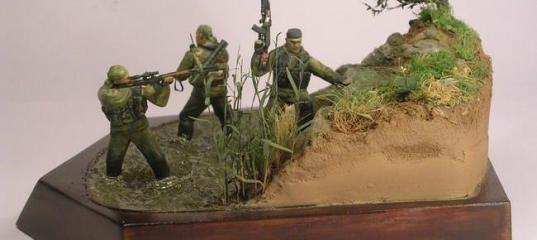 Çâåçäà 1/35 Ñïåöíàç ÃÐÓ (Zvezda GRU)Íàêàíóíå ïðàçäíîâàíèÿ äíÿ ÂÄ ïðåäñòàâëÿþ ìèíèäèîðàìó «Ñïåöíàç ÃÐÓ». Çà îñíîâó áûë âçÿò íàáîð ôèðìû «Çâåçäà» «Ðîññèéñêèé ñïåöíàç ¹1». Ïîñëå ôîðìèðîâàíèÿ îñíîâíîé èäåè ìèíèàòþðû áûë âûáðàí âàðèàíò ñîáèðàòåëüíîãî îáðàçà áîéöîâ, ò.ê. â ðåàëüíûõ óñëîâèÿõ áîéöû ðàçëè÷íûõ ðàçâåäûâàòåëüíûõ ãðóïï ýêèïèðóþòñÿ ïî ðàçíîìó êàê ñíàðÿæåíèåì, òàê è ôîðìîé. Ñþæåò ìèíèàòþðû îòîáðàæàåò ïåðåõîä ãîëîâíîãî äîçîðà ÷åðåç áðîä îäíîé èç ãîðíûõ ðåê ñåâåðíîãî Êàâêàçà. Òóò íóæíî îòìåòèòü, ÷òî â ðåàëüíîì ãîëîâíîì äîçîðå, áîéöû ðàçâåäûâàòåëüíûõ ãðóïï ñïåöèàëüíîãî íàçíà÷åíèÿ òàê ïëîòíî íå íàõîäÿòñÿ. Ïðè ôîðìèðîâàíèè îñíîâàíèÿ ÿ äîïóñòèë âîëüíîñòü, ïîñêîëüêó ðàññòàâëÿÿ òðè ôèãóðû íà ðàññòîÿíèå 10-14 ñàíòèìåòðîâ, ÷òî áûëî áû äîñòîâåðíåé, ÿ áû èìåë îñíîâàíèå íå ìåíåå 25-30 ñàíòèìåòðîâ, ÷åãî ìíå íå õîòåëîñü, íà òàêèõ ãàáàðèòàõ ðàçâåä÷èêîâ áû óæå íèêòî è íå çàìåòèë. ÔèãóðûÔèãóðû áîéöîâ áàçîâîãî íàáîðà áûëè íåìíîãî êîíâåðñèðîâàíû. Âñå ãîëîâû ôèãóð áûëè çàìåíåíû íà ãîëîâû îò íàáîðà «Ìîðñêàÿ ïåõîòà» ôèðìû «Çâåçäà». Ãîëîâíûå óáîðû – «áàíäàíû» âûëåïëåíû èç äâóõêîìïîíåíòíîé àâòîìîáèëüíîé øïàêë¸âêè. Ñ ôîðìû ñðåçàë âñå êàðìàíû èç óïîìèíàâøåéñÿ ðàíåå øïàêë¸âêè, íàðàñòèë ïîëû êóðòîê, èçìåíèë ãîðëîâèíû íà ðàñïàõíóòûå, ñûìèòèðîâàë ðåçèíêè â ðàéîíå ãîëåíè è ïîëó÷èëàñü óçíàâàåìàÿ ðàííÿÿ «Ãîðêà». Ó áîéöà âûõîäÿùåãî èç âîäû, íîãè èñïîëüçîâàíû îò äâóõ ðàçíûõ ôèãóð áàçîâîãî íàáîðà. Çà ñïèíó ïîäâåøåí âûëåïëåííûé êîììåð÷åñêèé ðþêçàê òèïà «Áîá¸ð», ðåìíè ðþêçàêà äåëàë èç ôîëüãè, äîðàáîòàë öåâü¸ àâòîìàòà (ñ ïëàñòèêîâîãî íà äåðåâÿííûé), ðàìî÷íûé ïðèêëàä îáâÿçàë «ìåäèöèíñêèì æãóòîì», âíóòðè êîòîðîãî íîñÿò ïåðåâÿçî÷íûé ïàêåò è íàêëåèë ðåçèíîâûé àìîðòèçàòîð äëÿ ñòðåëüáû èç ïîäñòâîëüíîãî ãðàíàòîì¸òà. ÎñíîâàíèåÎñíîâàíèå äèîðàìêè èçãîòîâëåíî èç ïîðèñòîãî ïåíîóòåïëèòåëÿ, êàìåííûå âûñòóïû ñêàëüíûõ ïîðîä äåëàë èç äîðîæíîãî ùåáíÿ, ñ ïîñëåäóþùèì îêðàøèâàíèåì òåìïåðîé, ãðóíò èçãîòîâëåí èç ñòðîèòåëüíîé øïàêë¸âêè.