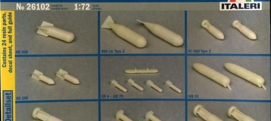Îáçîð Italeri 1/72 German Aircraft WeaponsÏîÿâèâøèåñÿ â êàòàëîãå Italeri íàáîðû íåìåöêèõ àâèàöèîííûõ áîìá ñðàçó ïðèâëåêëè ìî¸ âíèìàíèå - íè÷òî òàê íå óêðàøàåò áîìáàðäèðîâùèê, êàê îðèãèíàëüíàÿ "ïîäâåñêà". Îäíàêî, äàííûå íàáîðû â íàøèõ ìàãàçèíàõ íå ïîÿâëÿëèñü, à çàðóáåæíûå îòïóãèâàëè ñâîåé öåíîé - îò 30 "âå÷íîçåë¸íûõ". Ïîýòîìó, êîãäà íà "Ëàêèìîäåëñ" ïîÿâèëñÿ íàáîð ¹26102 "âñåãî" çà 20$, ðåøèë åãî âçÿòü. È âîò, äîëãîæäàííàÿ êîðîáêà ó ìåíÿ â ðóêàõ. Íà ëèöåâîé ñòîðîíå êîðîáêè èçîáðàæåíî ñîäåðæèìîå êîðîáêè, à íà îáîðîòå ïðèâåäåíà èíôîðìàöèÿ, êàê ýòî ñîäåðæèìîå ïðàâèëüíî ïîêðàñèòü. Öâåòà êðàñîê ïðèâÿçàíû ê ñòàíäàðòó RLM è êðàñêàì Model Master. Êîðîáêà ñîäåðæèò ïàêåò ñ 29 ñìîëÿíûìè äåòàëÿìè, ïîçâîëÿþùèìè ñîáðàòü:  èíñòðóêöèè äà¸òñÿ êðàòêàÿ èíôîðìàöèÿ ïî îáîçíà÷åíèþ áîìá è èõ îêðàñêå. Ïðèâåäåíû ïðèìåðû ïîäâåñêè áîìá ïîä îñíîâíûå òèïû ñàìîë¸òîâ "Ëþôòâàôôå". Êà÷åñòâî ëèòüÿ äåòàëåé âîîðóæåíèÿ ñðåäíåå. Ïîõîæå, ÷òî ìàñòåð-ìîäåëè áûëè âûïîëíåíû èç ïëàñòèêà, íà îòäåëüíûõ áîìáàõ âèäíû ïëîõî çàøêóðåííûå ñòûêè è ÷ðåçìåðíî ñîøêóðåííûå áàíäàæíûå ëåíòû. Ïîâåðõíîñòè ïîòðåáóþò îáðàáîòêè, à ñòàáèëèçàòîðû óòîí÷åíèÿ. Âî âñÿêîì ñëó÷àå, ÿâíûõ ïðåèìóùåñòâ ñìîëÿíûå áîìáû SC-250 è SC-500 ïåðåä èõ àíàëîãàìè, íàõîäÿùèìèñÿ â íàáîðàõ ìîäåëåé ñàìîë¸òîâ "Ëþôòâàôôå" íå èìåþò. Áàëî÷íûé äåðæàòåëü ER4 âûïîëíåí óïðîù¸ííî (îí æå ñîäåðæèòñÿ â íàáîðå 26101 ñ áîìáàìè SC-50 è ÀÂ-36) , êàê è ïóëåì¸òíûå ãîíäîëû WB 81 - ñòâîëû ñïàðåííûõ ïóëåì¸òîâ, õîòü è èìåþò îòâåðñòèÿ, íî îíè ñëåãêà îïëûâøèå è îâàëüíûå â ñå÷åíèè. "Èçþìèíêà" íàáîðà - òÿæ¸ëûå áîìáû SC-1000 "Herman", SD-1700 è ñïåöèàëüíûå - êàññåòíàÿ AB-500 è áðîíåáîéíàÿ ñ ðàêåòíûì óñêîðèòåëåì PC-500RS. Åñëè âû ñâÿçûâàåòåñü ñ ïðîèçâîäèòåëÿìè èëè ïðîäàâöàìè íàáîðîâ/aftermarket è äåòàëåé - ïîæàëóéñòà, óïîìÿíèòå èì, ÷òî âû óçíàëè î íèõ íà ScaleModels.ru.