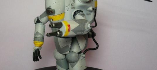 Хотя и совершенно непонятно, зачем все это, но выглядит, однозначно, более внушительно Так же заменил пальцы на манипуляторе типа «клешня», имитировов гофрированную поверхность пальцев с помощью намотанной проволоки. Так же сделал нижний ствол лазера (или что там у него) из иголки от шприца, ну и добавил антенны, проводку и болтов по мелочам. В наборе были даны резиновые гофрированные трубочки для закрытия шарниров у подвижных частей скафандра, но как-то они не понравились, да и держались плоховато. Так что пришлось пожертвовать подвижностью ручек-ножек, и сделать их из двухкомпонентной шпаклевки, после чего зубочисткой постарался изобразить складки ткани или резины.