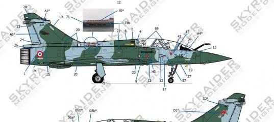 Äåêàëè, êîòîðûå äîëæíû èñïîëüçîâàòüñÿ äëÿ èìèòèðîâàíèÿ ïàðû óñòðîéñòâ âûáðîñà ëîâóøåê íà 24 çàðÿäà ïî îáåèì ñòîðîíàì â âåðõíåé ÷àñòè ôþçåëÿæà ïåðåä êèëåì, à òàê æå óñòðîéñòâà âûáðîñà ñèñòåìû âûáðîñà ëîâóøåê Spirale íà 8 çàðÿäîâ. Ýòè äåêàëè íàïå÷àòàíû ìåòàëëèçèðîâàííîé êðàñêîé, êîòîðàÿ âåñüìà õîðîøî èìèòèðóåò àëþìèíèé, à òàêæå âåñüìà åñòåñòâåííûé àëþìèíèåâûé áëåñê. Ñ èñïîëüçîâàíèåì âåçåðèíãà îíè ìîãóò âûãëÿäåòü âåñüìà ðåàëèñòè÷íî. Ìíå î÷åíü æàëêî, ÷òî ôèðìà Skyraider íå âêëþ÷èëà â íàáîð ðèñóíîê äåâóøêè è Ìèðàæà ñ íàäïèñüþ "1500 Heures" («1500 ÷àñîâ»), êîòîðûé ìîæíî óâèäåòü íà ôîòîãðàôèè íèæå, êàê è íà áîëüøèíñòâå ôîòîãðàôèé ñàìîëåòà Mirage 2000D íîìåð 625 èç ýñêàäðèëüè 3-IK, íî èìåííî ýòîò ïîäâåñíîé áàê RP541 ïîäâåøèâàëñÿ íå âñåãäà... ß òàê ïðåäïîëàãàþ. Æàëü, ïîòîìó ÷òî áûëî áû õîðîøèì è êðàñî÷íûì äîïîëíåíèåì ê ìîäåëè.