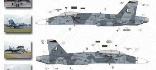 Декаль носит двойной индекс 72-068/32-043 и предназначена сразу для двух масштабов – 1:72 и 1:32. На выбор предлагается собрать один из двух вариантов модели: одноместный модификации А либо двухместный модификации В. Оба борта относятся к эскадрилье VFC-12 “Fighting Omars”, которая в настоящее время является одной из двух эскадрилий резерва авиации ВМФ США. Состоит эскадрилья из 12 самолетов: 10 F/A-18A и двух F/A-18B. Про саму эскадрилью можно кратко прочитать вот здесь.