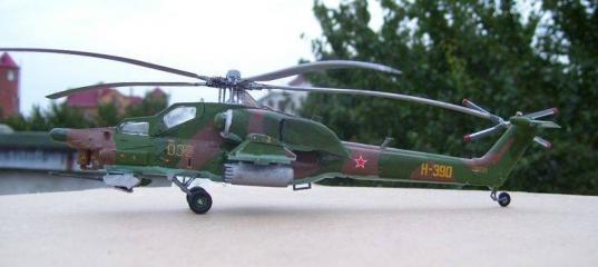 À òåïåðü áëèæå ê äåëó. Çà îñíîâó áûë âçÿò âåðòîë¸ò Ìè-28À ñ ïåðâîíà÷àëüíûì ðàñïîëîæåíèåì ðàäèîëîêàöèîííûõ ñèñòåì ñ áîðòîâûì ¹ 32 æåëòûé. Äàííàÿ ìàøèíà äåìîíñòðèðîâàëàñü íà ìåæäóíàðîäíîì àâèàñàëîíå â Ëå-Áóðæå. Òàêæå ìîäåëü ñåãî âèíòîêðûëîãî ËÀ âûïóñêàåò ïèòåðñêàÿ ôèðìà «Ìîäåëèñò» (ìàñøòàá 72-îé êàò. ¹ 207224) ôèðìà «Çâåçäà» (î êîòîðîé ïîéä¸ò ðå÷ü) Äëÿ ìîäåëè â 72-îì ìàñøòàáå ôèðìà «Áåãåìîò» âûïóñòèëà óíèôèöèðîâàííóþ äåêàëü äëÿ ìîäåëåé âåðòîë¸òîâ Ìè-28, Êà-50/-52 (êàò. ¹ BGM 72005).Ïîëðîáíåå î äåêàëè ìîæíî ÷èòàòü íà ñàéòå ôèðìû Áåãåìîò. Ìîäåëü âåðòîë¸òà Ìè-28À ôèðìû «Çâåçäà» ìàñøòàá 1/72. Àðò. ¹ 7246 Íà êîðîáêå èçîáðàæåí áîðò ¹ 032 àòàêóþùèé áåçûçâåñòíóþ ïîçèöèþ êîìïëåêñîì «Øòóðì». Äîâîëüíî êðàñî÷íûé ðèñóíîê.  êîðîáêå ëåæàëà èíñòðóêöèÿ, 4 ïëàòû ñ äåòàëÿìè + 1 ïëàòà ñ ïðîçðà÷íûìè äåòàëÿìè. Îòëèâêè õîðîøåãî êà÷åñòâà, áåç îáëîÿ. Èíñòðóêöèÿ ÷åðíî-áåëàÿ, íà 5-òè ÿçûêàõ, òðàäèöèîííàÿ çâåçäîâñêàÿ ðàñêëàäóøêà. Äåêàëü õîðîøåãî êà÷åñòâà. Ïðè íàíåñåíèè ïðîáëåì íå áûëî. Äàíà íà äâà âàðèàíòà ðàñêðàñêè 08 æåëòûé (ÿ ÷òî-òî òàêîãî íå âñòðå÷àë) è 032 æåëòûé (êîòîðûé, ñîáñòâåííî è íóæåí). Òåõíè÷êè ìàëî, ïðàêòè÷åñêè íå÷èòàåìàÿ. È òóò ñòîèò îãîâîðèòüñÿ, ÷òî, ïî-ìîåìó, ïðîèçâîäèòåëü íàìóäðèë ñ äåêîé: íàñêîëüêî ìíå ïîìíèòñÿ, òî íàäïèñü íà õâîñòîâîé áàëêå Í-390 íàíîñèëàñü íà Á/¹ 32 æåëòûé, à íå íà íåèçâåñòíûé Á/¹ 08. Îêðàñêà äàíà ïî ïàëèòðå Çâåçäû è êðàñêè Model Master. Ïëàñòèê õîðîøåãî êà÷åñòâà áåç îáëîÿ, óòÿæèí è ñëåäû òîëêàòåëåé îòñóòñòâóþò. Ðàñøèâêà î÷åíü òîíêàÿ, âíóòðåííÿÿ. Êë¸ïêà âîñïðîèçâåäåíà àêêóðàòíî è î÷åíü êðàñèâî, æàëêî, ÷òî â ïðîöåññå ïîñòðîéêè áîëüøàÿ å¸ ÷àñòü óãðîáèòñÿ.  ÷åðòåæè ìîäåëü íå óêëàäûâàë, èáî îòñóòñòâóþò. Íàøëàñü òîëüêî îäíà, áîëåå-ìåíåå ïðèëè÷íàÿ ñõåìà â îäíîì èç àíãëèéñêèõ ñáîðíèêîâ çà 1989 ã. Õîòÿ ÷åìó óäèâëÿòüñÿ – ïðîòîòèï – ñåðèéíàÿ áîåâàÿ ìàøèíà, ñòàëî áûòü, åñòü êàêîé-òî ãðèô ñåêðåòíîñòè. Òàê, íàâñêèäêó, ïî ôîòî, ìîäåëü íàïîìèíàåò ïðîòîòèï. Ñòûêóåìîñòü ïðèìåðíî íà 4+: áûëè íåêîòîðûå íåäî÷¸òû â ðàéîíå âûõëîïà (ðåø¸òêà âûõëîïà ìåíüøå îòâåðñòèÿ) , ïðè ñêëåéêå ìîòîãîíäîë (îáðàçîâàëñÿ øîâ, êîòîðûé áûë ëèêâèäèðîâàí øïàòë¸âêîé), ïðè ñêëåèâàíèè ïóøêè (íå ñòàíîâèëîñü ïàðó äåòàëåé (ìîæåò ó ìåíÿ ðóêè êðèâûå?)) è ñðàçó çà âòóëêîé íåñóùåãî âèíòà – â ðàéîíå âîçäóõîçàáîðíèêà (îáðàçîâàëñÿ øîâ ïðè óñòàíîâêå ÂÇ, êîòîðûé áûë ëèêâèäèðîâàí øïàòë¸âêîé). Ìåëî÷åâêà ïðîëèòà õîðîøî, êà÷åñòâåííî. Õâîñòîâàÿ ñòîéêà øàññè äàíà îäíîé äåòàëüþ, âìåñòå ñ êîëåñîì. Âòóëêà íåñóùåãî âèíòà îòëèòà äîñòàòî÷íî òîïîðíî, íî ìîæåò îíî è ïðàâèëüíî, ïîñêîëüêó äà¸òñÿ âàðèàíò ñäåëàòü íåñóùèé âèíò âðàùàþùèìñÿ. Ëè÷íî ÿ óõèòðèëñÿ íà ìîäåëè ñäåëàòü ïîäâèæíûì: íåñóùèé è ðóëåâîé âèíòû, ïóøêó è õâîñòîâóþ îïîðó øàññè (âîêðóã ñâîåé îñè íà 360 ãðàä.). Âîîðóæåíèå ïðåäñòàâëåíî áëîêàìè ÍÀÐ è êîìïëåêñîì «Øòóðì». Ïî ÍÀÐàì ìîãó, ñêàçàòü, ÷òî òîæå îòëèòû ïðèìèòèâíî, íî íà æèçíü õâàòàåò. Èíòåðüåð áåäíûé. Âêëþ÷àåò â ñåáÿ ïðèáîðêó, ðó÷êó è êðåñëî ïèëîòà. Ïðèáîðêà äàíà äåêàëüþ. È ÷òîáû ñêðàñèòü âñ¸ ýòî äåëî äà¸òñÿ ôèãóðêà ïèëîòà. Íî ÿ åãî ñàäèòü íå áóäó, ïî òîé ïðîñòîé ïðè÷èíå, ÷òî ïðîèçâîäèòåëü ïîñòàðàëñÿ è ñäåëàë ïðîâèñàíèå ëîïàñòåé ÍÂ, êàê íà ñòîÿíêå. Òîãäà ïîëó÷àåòñÿ, ÷òî ë¸ò÷èê ñ ïîëíûì áîåêîìïëåêòîì ñèäèò íà ñòîÿíêå. Åñëè èñêðèâèòü ëîïàñòè â îáðàòíóþ ñòîðîíó, òî ìîæíî ïîëó÷èòü ìàøèíó â ïîë¸òå. ß æå èçãàëÿòüñÿ íå ñòàë, íå ïîñàäèë ë¸ò÷èêà è ëîïàñòè îñòàâèë, êàê åñòü. Îñòåêëåíèå ïðîçðà÷íîå, áåç êàêèõ ëèáî âèäèìûõ èçúÿíîâ. Íî åñòü íåäîñòàòî