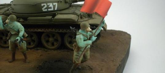 ÌîäåëüÏðåäñòàâëÿåò ñîáîé âñåì èçâåñòíûé ðàííèé Ò-62 îò Trumpeter ñ íåçíà÷èòåëüíûìè äîäåëêàìè â âèäå òîïëèâîïðîâîäîâ è êîå-êàêîé ïðîâîäêè ê ôàðàì. Îêðàøåíî ñìåñüþ òàìèåâñêîãî "Îëèâ äðýá" è "Õàêè" ñ äîáàâëåíèåì òåìíî-çåëåíîãî. Áîéöû îò ôèðìû Êàïèòàí. Ñìîëÿíûå ôèãóðû ñòðåëêîâ â ÊÇÈ ïîäâåðãëèñü îïðåäåëåííîìó ïåðåïèëó ñ öåëüþ ïðèäàíèÿ íóæíûõ ïîç è îêðàøåíû õóäîæåñòâåííûì àêðèëîì. Îðóæèå èì áûëî äîáàâëåíî èç äðóãèõ íàáîðîâ ýòîé æå ôèðìû, èç òîé æå ñåðèè î øåñòèäåñÿòûõ.