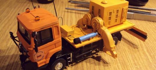 Защиту стекла заднего вида сделал из тонкой проволоки, трапик набрал из прутков эвергрина, резиновый фартук на месте бампера сымитировал толстой фольгой. Фары от Elf, кенгурятник из проволоки и прутков эвергрина.