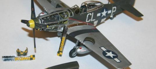 Tamiya 1/72 P-51D Mustang Da QuakeÌîäåëü ñòðîèëàñü â ðàìêàõ ÃÁ «èñòðåáèòåëè ñ èíäåêñîì л. Ïðè ïîñòðîéêå èñïîëüçîâàëàñü âñåì õîðîøî çíàêîìàÿ ìîäåëü îò Tamiya è áîëüøîé íàáîð ñìîëû îò Aires, âêëþ÷àþùèé â ñåáÿ: êàáèíó, íèøè øàññè, äâèãàòåëü, ïóëåìåòíûå íèøè è íåáîëüøóþ ïëàòó òðàâëåíèÿ. Ñíà÷àëà ïðåäïîëàãàëîñü ñòðîèòü îäèí èç âàðèàíòîâ, ïðåäëàãàåìûõ ïðîèçâîäèòåëåì, ÷èñòî ñåðåáðèñòûé íå õîòåëîñü ñîâñåì, ðåçàòü «êóêëó» è óáèòü òåì ñàìûì âåñü åå øàðì íå õîòåëîñü, ïîýòîìó âûáîð ïàë íà «Old crow» çà íåèìåíèåì íè÷åãî áîëåå èíòåðåñíîãî. È âîò òóò ñëó÷èëîñü îäíî î÷åíü ïðèÿòíîå äëÿ ìåíÿ ñîáûòèå – íàø êîëëåãà Ñåðãåé «Gall» ëþáåçíî ïðåäîñòàâèë â ìîå ðàñïîðÿæåíèå äåêàëü îò EagleCal, çà ÷òî åìó åùå ðàç îãðîìíîå ñïàñèáî. Êàê òîëüêî ÿ ïîëó÷èë äåêàëü âñå ñîìíåíèÿ îòíîñèòåëüíî âûáîðà ïðîòîòèïà ìîäåëè îòïàëè, áóäó ñòðîèòü Da’Quake. ÈñòîðèÿP-51D 44-13954 ïðîèçâåäåí 16 èþíÿ íà çàâîäå North American Aviation ÑáîðêàÂîîáùå âñþ ñáîðêó ìîäåëè ìîæíî îïèñàòü íåñêîëüêèìè ñëîâàìè. Ýòî óäîâîëüñòâèå îò ñáîðêè è ïîêðàñêè ïëàñòèêîâûõ è ñìîëÿíûõ äåòàëåé îòäåëüíî äðóã îò äðóãà è óæàñ îò ïðèâåäåíèÿ îíûõ ê åäèíîìó öåëîìó. Åùå ðàç óáåäèëñÿ, ÷òî ñìîëà ýòî çëî.
