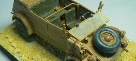 Tamiya 1/35 Kubelwagen type 82Доброго времени суток,коллеги. Вот после длительного перерыва, решил немного размять руки и собрать небольшую модель. Выбор пал на недавно приобретенную модель "арийского" легкового трудяги Kubelwagen от Tamya. Думал собрать с ходу из коробки,но в итоге не обошлось без небольших доработок. Были срезаны родные подножки у передних дверей-заменены на жестяные, установлены скобы крепления тента(вышли немного крупнее чем на прототипе..),кольца буксирных крюков,ручки капота, - все из медной проволоки. Далее - проводка к фарам и дворникам,к сигналу делать не стал т.к. ее на прототипе не особо заметно, а на модели в 1/35 и подавно,имхо. На правое крыло установлена дополнительная канистра с крепежом,и крепления лопаты также заменены на жестяные,пластиковые как-то не очень выглядят. По доработкам в общем то все,еще хотел изготовить скатку тента,но в итоге ничего путного не вышло,оставил родную. |