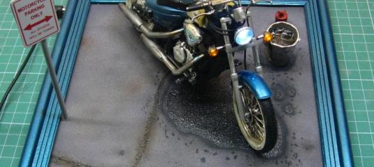Ñëåäóþùàÿ ìî÷à ìíå ñòóêíóëà â ãîëîâó íà ñòàäèè íàíåñåíèÿ äåêàëåé. Êàê îáû÷íî ïîâîäîì äëÿ âñÿêèõ ïîäîáíûõ ïîäâèãîâ ñëóæèò êàêîé-òî êîñÿê.  ýòîì ñëó÷àå ýòî áûëà ðàçâàëèâøàÿñÿ äåêàëü íà áåíçîáàêå. Ñîáðàòü ïîëíîñòüþ åå íå óäàëîñü. Íàäî ÷åì-òî ýòîò êîñÿê çàêðûâàòü. Íà òîò ìîìåíò ÿ î÷åíü àêòèâíî ïûòàëñÿ ýêñïåðèìåíòèðîâàòü ñ âîäîé íà äèîðàìàõ. Ôèã ñ íèì, ïóñòü áóäåò ìîêðàÿ òðÿïêà. À âåñü ìîòîöèêë áóäåò â ïðîöåññå ïîìûâêè. Ïëþñ åùå ê ýòîìó ìåíÿ äàâíî ïîäìûâàëî ïîýêñïåðèìåíòèðîâàòü ñ âåçåðèíãîì íà êðóïíûõ ìàñøòàáàõ àâòî è ìîòîòåõíèêè, êîòîðûå òðàäèöèîííî ñ÷èòàþòñÿ «ãëÿíöåâûìè». Èòàê, ïîëîâèíà ìîïýäà áóäåò ìàòîâîé, ñî ñëåäàìè ãðÿçè è äîðîãè, ïîëîâèíà «ìîêðîé» ãëÿíöåâîé.  õîä ïîøëè ìàòîâûå àêàíîâñêèå ëàêè è ïèãìåíòû. Êàê òîñêëèâî áûëî çàäóâàòü ñâåæåîòïîëèðîâàííûå ïîâåðõíîñòè. Íà âòîðóþ ïîëîâèíó ïîøëà ôóòóðà è õýâè-ãåëü âàëåäæèî, ïðèçâàííûé èìèòèðîâàòü âîäó. Ïîâòîðþñü, âñÿ ýòà ñâèñòîïëÿñêà áûëà çàòåÿíà òîëüêî äëÿ òîãî ÷òîáû ïðèêðûòü ìàëåíüêóþ òðåùèíêó â äåêàëè