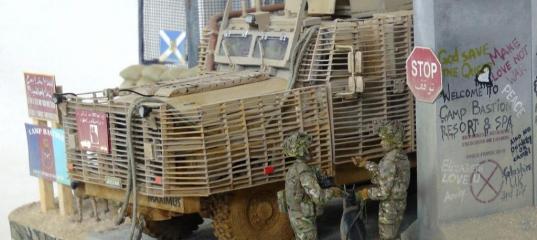 Íåìíîãî èñòîðèè è ñïðàâêèÊýìï Áàñòèîí ýòî îñíîâíàÿ âîåííàÿ áàçà Âåëèêîáðèòàíèè â Àôãàíèñòàíå. Íà áàçå íà ñåâåðî-âîñòîêå Ëàøêàðãàõà, ñòîëèöû ïðîâèíöèè Ãèëüìåíä, ïðîæèâàåò 21000 ÷åëîâåê è ðàñïîëàãàåòñÿ øòàá ëîãèñòèêè â ïðîâèíöèè Ãèëüìåíä. Êýìï Áàñòèîí ýòî êðóïíåéøàÿ âîåííàÿ áàçà Âåëèêîáðèòàíèè çà ðóáåæîì, ïîñòðîåííàÿ ïîñëå Âòîðîé ìèðîâîé âîéíû. Ïîñòðîåííàÿ â íà÷àëå 2006-ãî ãîäà, áàçà íàõîäèòñÿ â óäàëåííîé ïóñòûííîé ìåñòíîñòè â îòäàëåíèè îò íàñåëåííûõ ïóíêòîâ. Áàçà, ïðîòÿæåííîñòüþ 4 ìèëè â äëèíó è 2 ìèëè â øèðèíó, èìååò àýðîäðîì è ïîëåâîé ãîñïèòàëü. Òàêæå òàì íàõîäÿòñÿ: àìåðèêàíñêàÿ áàçà Camp Leatherneck è àôãàíñêàÿ áàçà Camp Shorabak.Äëÿ ìîäåëèèñïîëüçîâàë ïëàñòèê, îêîííûé óãîëîê, ðàçìåðîì 100õ100 ìì, è ðàçíûå êîïèè èç ïîóëåðèòàíà îò Áóôôàëî â ò.÷. Êîë¸ñà, ïîäâåñêó. Áîëåå ïîäðîáíî îïèñûâàë â ïðåäûäóùåé ñòàòüå ïðî Âóëüôõàóíä, òàê êàê äåëàë ñðàçó 3 øòóêè (îäíîòèïíûå äåòàëè) Ìàñòèôô, Âóëüôõàóíä è Êóãàð 4õ4.Äëÿ äèîðàìûÏîäñòàâêà: ïëàñòèê (îêîííûé óãîëîê 150õ150ìì), ïåñîê èç ñîáñòâåííûõ çàïàñîâ (Âüåòíàì), íåìíîãî îòëèòûõ èç ïëàñòèêà Õåñêî áàððèåðç (hesco barriers) îñòàòêè ñ ïðîøëîé äèîðàìû. Ñòðîåíèå, èñòî÷íèê ý/ï, Áðåìåð Óîëë (Bremer Wall), ðàìû äëÿ ðåø¸òîê, âîðîòà, ìåøêè ñ ïåñêîì, ïàðà ñîáàê âñ¸ ýòî èçãîòîâèë íà 3D ïðèíòåðå, ïîñêîëüêó òîëüêî ïðèîáð¸ë è òîëêîì íå ðàçîáðàëñÿ êàê èì ïîëüçîâàòüñÿ, ðåøèë îïðîáîâàòü è íàó÷èòñÿ íà äèîðàìå, ïîýòîìó ìíîãîå èçãîòîâëåíî íà í¸ì, ðåçóëüòàòîì äîâîëåí, õîòü è íåðâîâ ñåáå ïîïîðòèë è âðåìåíè íà ïåðâûõ ïîðàõ çàíÿëî ìíîãî, êîãäà åù¸ íå óìåë ïå÷àòàòü. Íî ó÷èòñÿ íà ÷¸ì òî íàäî áûëî. Êðàñèë âñ¸ Âàëëåäæî, êðåïèë ïåñîê ñìåñüþ ëàêà ìàòîâîãî Âàëëåäæî ñî ñïèðòîì è âîäîé. Äåêàëè ñàìîñòîÿòåëüíî, ïå÷àòàë íà ïðèíòåðå íà äåêàëüíîé áóìàãå. Ïëèòêè äåëàë èç ãèïñà.Äëÿ ñîëäàòêàê îáû÷íî, êîïèè èç ïîóëåðèòàíà, íàáîð ÷òî è íà ïðåäûäóùåé äèîðàìå ïðî Âóëüôõàóíä. Íàáîð àìåðèêàíñêèå âîåííûå ðàçãðóæàþò ãðóçîâèê ôèðìû òðóìïåòåð è 1 ôèãóðà ñèäÿ÷åãî ñîëäàòà Àêêóðàò Àðìîð (accurate armor) Jackal crew. Ñ 3õ êîïèé áðîíèêà Accurate armor Jackal crew, ñ÷èùåíî øêóðêîé âñ¸ è íàíåñåíû íîâûå ìîëåøíûå ïåòëè ñ ïîìîùüþ ôîëüãè èç áàíî÷êè ñìåòàíû èëè ñûðíîãî ñîóñà, äà ÿ óæå è íå ïîìíþ, äà ýòî è íå âàæíî. Äàëåå èç ðîññûïè ðóê, íîã, ãîëîâ, îáâåñà, âèíòîâîê ñäåëàíû 5 ôèãóðîê. Âîëûíêó ñäåëàë èç òåððàêîòîâîé ñìåñè, òðóáêè èç ïðîâîëîêè è áèñåðà, áåðåòû òîæå èç òåððàêîòà. Äàëåå ïå÷àòü íà ïðèíòåðå ðàçíûõ íàøèâîê, íà ôîòî æàëêî ïëîõî âèäíî((Ñïàñèáî çà âíèìàíèå.