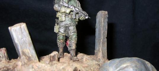 Îòêëàäûâàëîñü ýòî äåëî äîâîëüíî äîëãî, íî ïîòîì, êàê âîäèòüñÿ, ïîìîã ñëó÷àé. Ïðîïàäàë êóñîê «Ýïîêñèëèíà» è ÿ ïîäóìàë òàê — åñëè ó íàñ èìååòñÿ íåêèé «Ñîëäàò Áóäóùåãî», çíà÷èò ýòî äîëæíî áûòü ÷òî-òî òèïà Òðåòüåé Ìèðîâîé âîéíû, Âîñòîê ïðîòèâ Çàïàäà. À êàê ïîêàçàòü ýòó ñàìóþ óñëîâíóþ «ëèíèþ áîåâîãî ñîïðèêîñíîâåíèÿ»? È âîçíèêëà òàêàÿ èäåÿ - ýòà ñàìàÿ «ëèíèÿ» äîëæíà, ïî èäåå, ïðîõîäèòü ïî ìåñòàì, ãäå ñíîñÿò ïàìÿòíèêè ñîâåòñêîé ýïîõè. À ðàç òàê — íàäî ïîêàçàòü ÷òî-òî, âðîäå ðàçáèòîãî ïàìÿòíèêà. À òóò óæ íå ïðèäóìàëîñü íè÷åãî, êðîìå «ìåðòâåöà êîòîðûé âñåõ æèâûõ æèâåé», òî åñòü «Äåäóøêè Ëåíèíà»(òóò ÿ êñòàòè, âîâñå íå îðèãèíàëåí — ìíå ïîïàäàëàñü íåêàÿ ôèãóðà â 1/32 èç «Ñòàëêåðñêîé» ñåðèè , ãäå íà ïîäñòàâêå áûëà îòëèòà îòáèòàÿ îò ñòàòóè ãîëîâà Â.È.Ëåíèíà, òîëüêî òîò «Èëüè÷» áîëüøå ïîõîæ íà àêò¸ðà Âèêòîðà Ñóõîðóêîâà èç ôèëüìà «Êîìåäèÿ ñòðîãîãî ðåæèìà», à íå âîæäÿ ìèðîâîé ðåâîëþöèè).  îáùåì, ÿ ñëåïèë ÷àñòè÷íî ðàñêîëîòóþ ãîëîâó «Èëüè÷à», èñõîäÿ èç êîëè÷åñòâà èìåþùåãîñÿ «Ýïîêñèëèíà» è ïðåäïîëàãàÿ ÷òî ñòàòóÿ áûëà áåòîííàÿ. Êîíå÷íî, èñõîäÿ èç ðàçìåðà ãîëîâû ðàçìåð âñåé ñòàòóè äîëæåí áûë áûòü íó î÷åíü èçðÿäíûé (òàêèõ ïî-ìîåìó ñ 1950-õ óæå íå ñòàâèëè), íó äà ëàäíî — ó ìåíÿ ïðè ýòîì ïåðåä ãëàçàìè, ÷åñòíî ãîâîðÿ, áûë çàâàëåííûé ðàçáèòûìè ïàìÿòíèêàìè ïóñòûðü èç ôèëüìà «Çîëîòîé Ãëàç»(òîò íà êîòîðîì Äæåéìñ Áîíä çàáèâàë ñòðåëêó ñ òàìîøíèì ãëàâãàäîì). Âîçèëñÿ ÿ ñ ýòîé ãîëîâîé äîâîëüíî äîëãî, â íåñêîëüêî ïðè¸ìîâ, íî âðîäå ïîëó÷èëîñü ïîõîæå íà ïàìÿòíèêè(ôîòî 4).