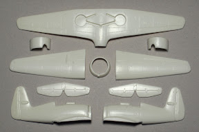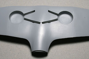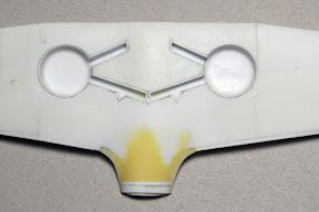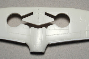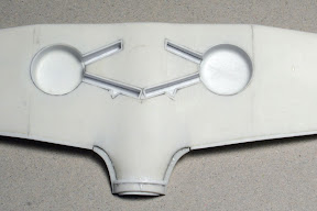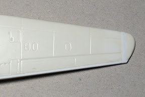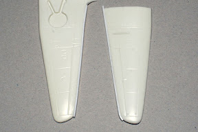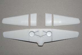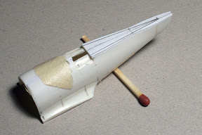 Крылья. Для увеличения хорды и размаха задние кромки и корневые части верхних половин надставлены, в районе законцовок сделаны вставки. Проблему хорды можно было бы решить проще, а именно - вырезать детали с небольшим припуском, но, как водится, я не догадался измерить детали на листе до их вырезания. Мой метод - "один раз отрежь, один раз отмерь, семь раз исправь"... V-образность излома верхних половин мне показалась недостаточной и была исправлена. Ниши сделаны с нуля, зализы увеличены.
