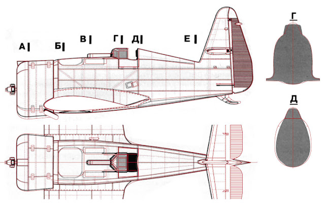 Как я уже писал выше, чертежи из АиВ вызывают у меня некоторые сомнения, в особенности это касается формы кабины, гаргрота, капота, зализов крыла, да и некоторые сечения выглядят более чем странно. Я постарался в меру сил исправить на этих чертежах то, что по сравнению с фотографиями показалось мне неправильным, и вот что получилось в результате (красный цвет – мой вариант). Естественно, об абсолютной точности тут говорить не приходится (привет теме о "±0.1 мм" ), но хочется хотя бы сохранить основные узнаваемые пропорции.