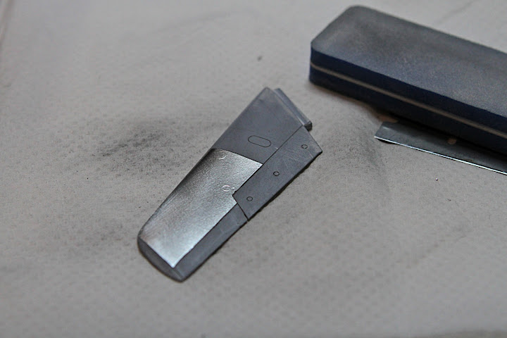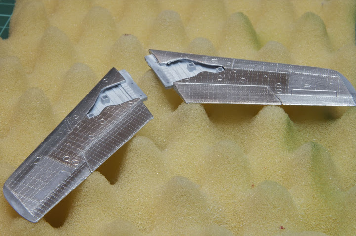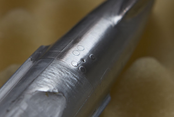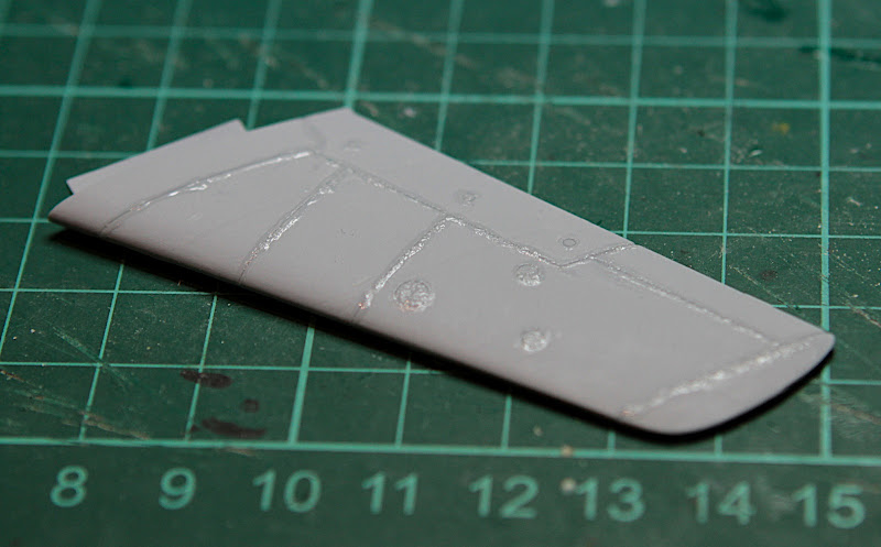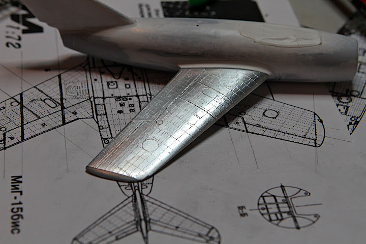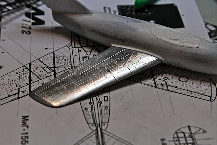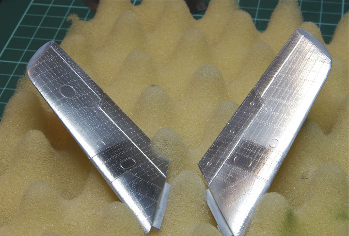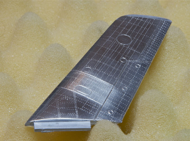 Правая консоль обклеена фольгой (по панелям) и сверяясь с чертежом на него нанесена клепка. Сразу скажу, что на чертеж я посматривал, но к особой точности не стремился. Крыло еще будет шкурится и полироваться по панелям.