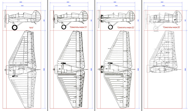 Попробуем присмотреться к чертежам. У нас имеются чертежи из "М-К", чертежи из "Самолетов мира" - аж 3 штуки, причем, первый из них полностью повторяет чертеж из "Советских самолетов", второй, очевидно, отображает второй экземпляр БОК-5 (в чертежах об этом ни гу-гу), а третий наиболее подробен и никак не соответствует двум другим в этой же публикации.Для начала все чертежи придется вогнать в размеры. В большинстве источников размеры указываются такие: