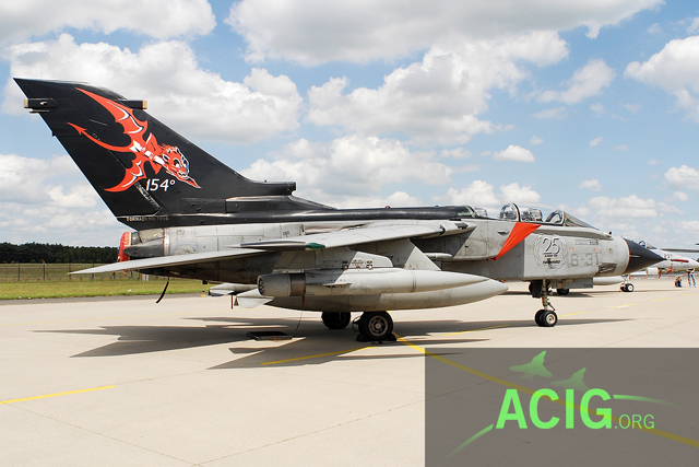 Далее, самолет командира 102-й группы п/п-ка Фриджерио и оператора п/п-ка Джусти по состоянию на апрель 2011 г. На борту 34 отметки, показывающие количество бомб, сброшенных всей группой в ходе Косовского конфликта в 1999 г. На воздухозаборниках силуэт диснеевского Дональда, символа группы.